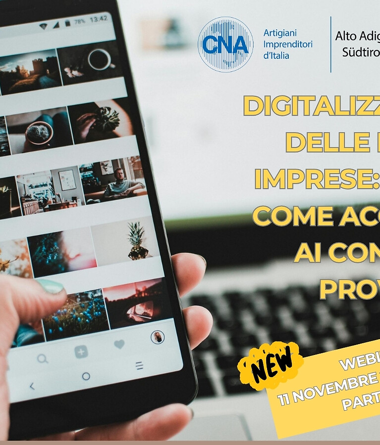 CNA Alto Adige Südtirol organizza un webinar (incontro online) martedì 11 novembre alle ore 17.30 per informare gli associati sui nuovi contributi provinciali per la digitalizzazione delle micro, piccole e medie imprese. Verranno fornite tutte le informazioni relative alla presentazione delle domande, ai requisiti richiesti e alle agevolazioni concrete.