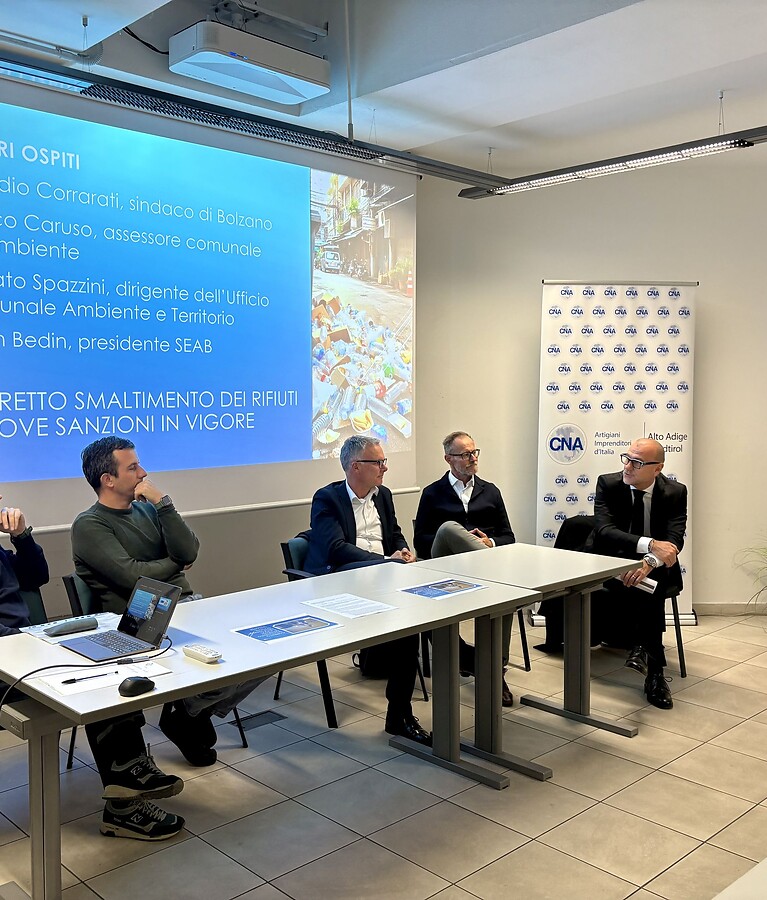 Il corretto smaltimento dei rifiuti e le soluzioni per garantire la pulizia e il decoro della città stati i temi discussi in un incontro organizzato da CNA Alto Adige Südtirol al quale hanno partecipato il sindaco di Bolzano, Claudio Corrarati, l’assessore all’Ambiente Marco Caruso, il dirigente comunale Renato Spazzini, Kilian Bedin e Matthias Fulterer, rispettivamente presidente e direttore generale di SEAB.