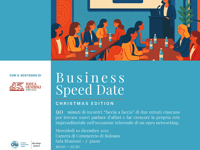 CNA Impresa Donna Alto Adige Südtirol organizza un Business Speed date Christmas Edition, in programma mercoledì 10 dicembre 2025 alla Camera di Commercio di Bolzano.
